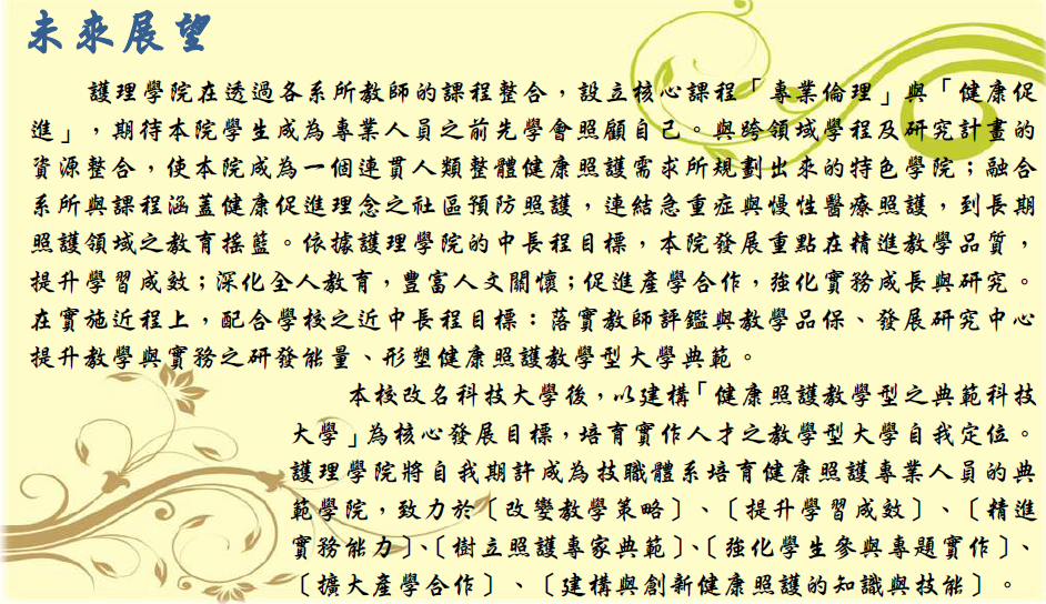 本校改名科技大學後,以建構「健康照護教學型之典範科技大學」為核心發展目標,培育實作人才之教學型大學自我定位。護理學院將自我期許成為技職體系培育健康照護專業人員的典範學院,致力於 [改變教學策略]、[提升學習成效]、[精進實務能力]、[樹立照護專家典範]、[強化學生參與專題實作]、[擴大產學合作]、[建構與創新健康照護的知識與技能]。